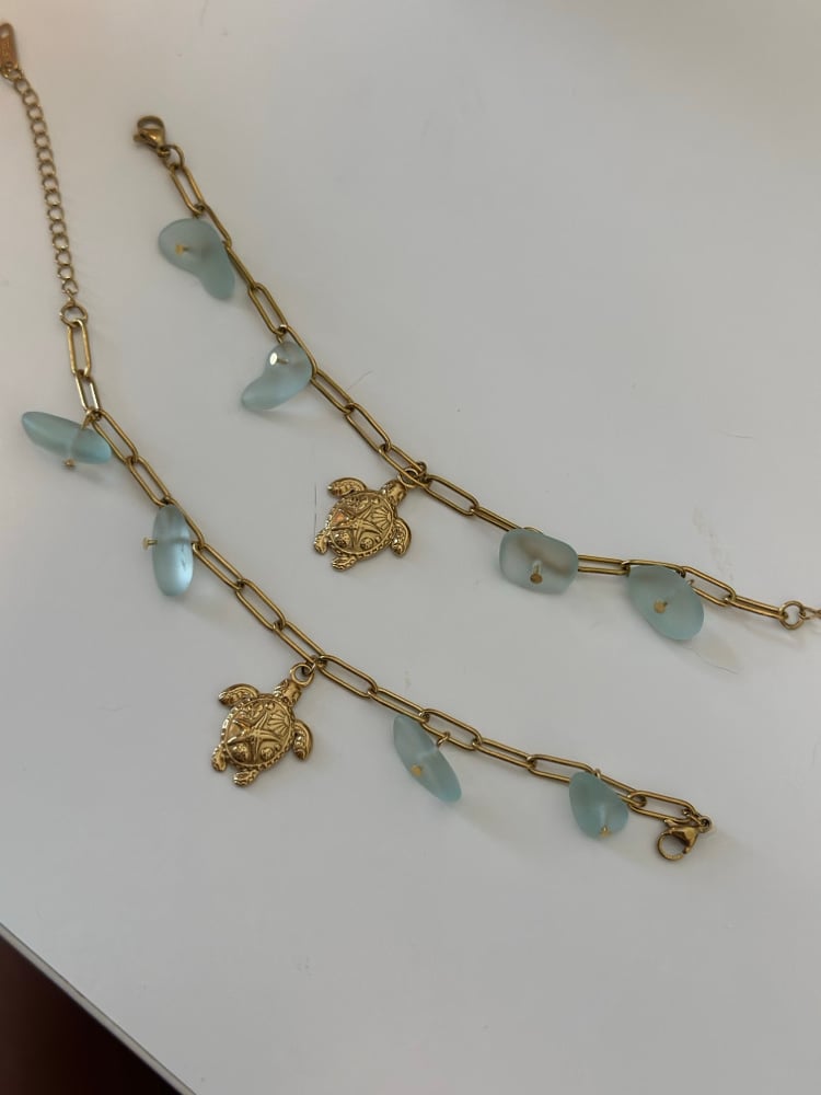 The Aquamarine Necklace is a dreamy necklace handcrafted with soft aqua glass beads and a golden turtle charm. It’s your ocean treasure—made to wander with you, wherever the waves may call.