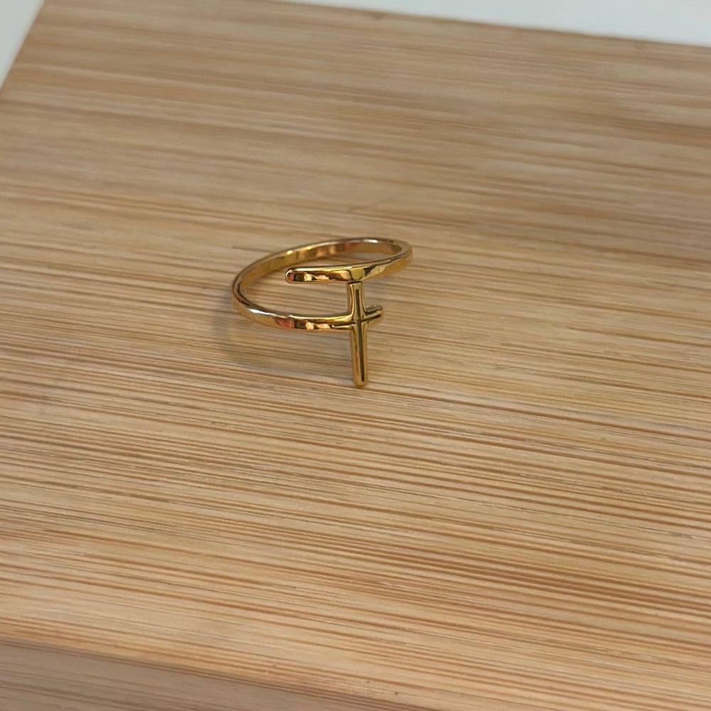 A delicate cross ring that blends faith with everyday elegance. Made with 18K gold-plated stainless steel and an adjustable fit for comfort and shine that lasts.