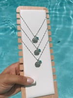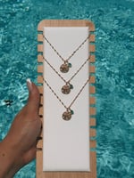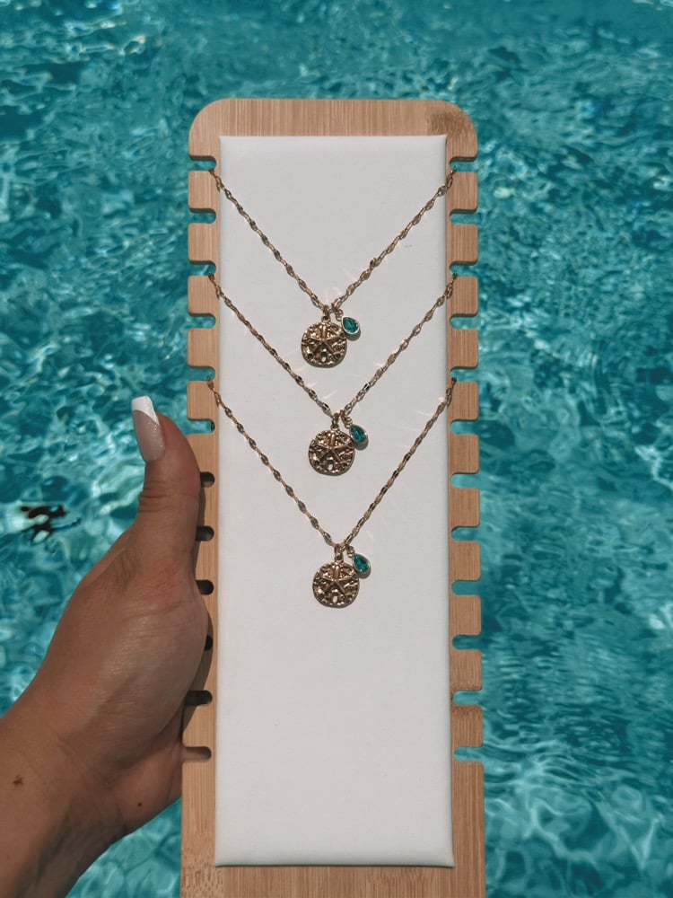 The Coastal Dream is your dainty dose of the seaside — featuring a beautifully detailed sand dollar charm paired with an aqua-colored pendant that captures the glow of tropical waters. Suspended on an ultra-delicate chain, this necklace is crafted from high-quality 18k gold PVD-coated stainless steel (or classic stainless steel for the silver option) — meaning it’s waterproof, tarnish-resistant, and built to shine wherever you go.