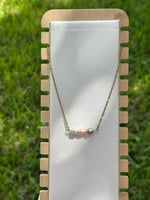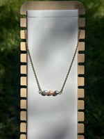 Elevate your look with the Moonlit Trio Pearl Choker, a dainty 18K gold-plated chain designed to sit gracefully around the neck. Three flat freshwater pearls rest in the center, each one unique in color and shape, reflecting the quiet magic of nature. Laying as a tighter fit or a bit longer this piece is a serene statement of delicate beauty and natural elegance.