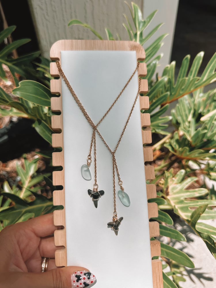 Each necklace features a real lemon shark tooth, found along the Florida coast and paired with a glimmering aqua glass bead, like a drop of the sea frozen in time. 🌊